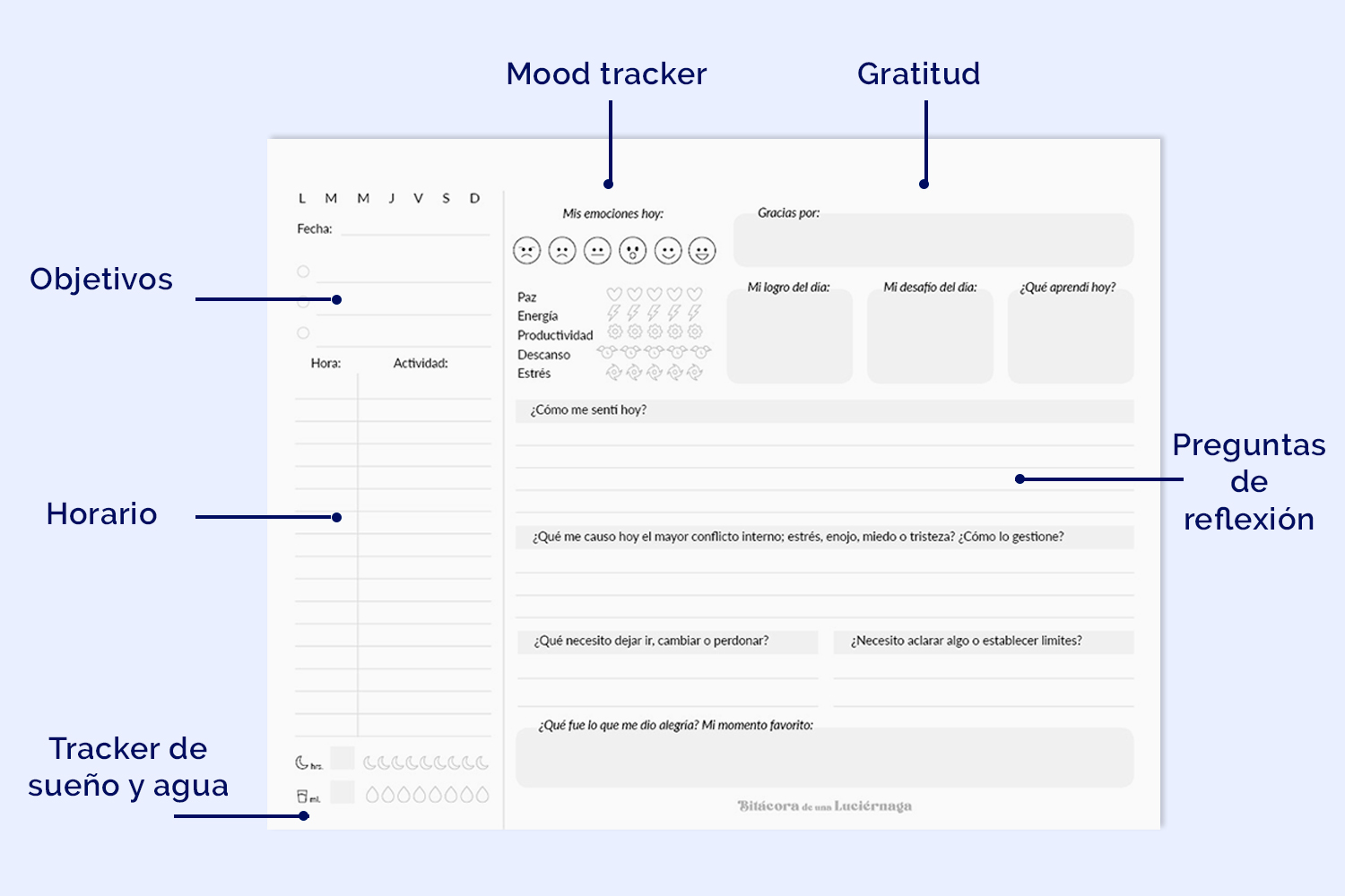 Tracker de emociones, sueño, agua, energía y productividad.